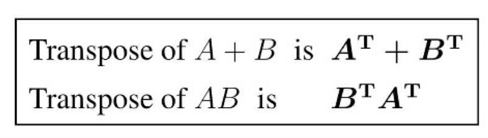 여기서 특이한 점은 ((AB))의 transpose를 하면 순서가 바뀐다는 것입니다. 이것을 응용하여 ((A^{T}))((A))의 transpose도 구할 수 있습니다.