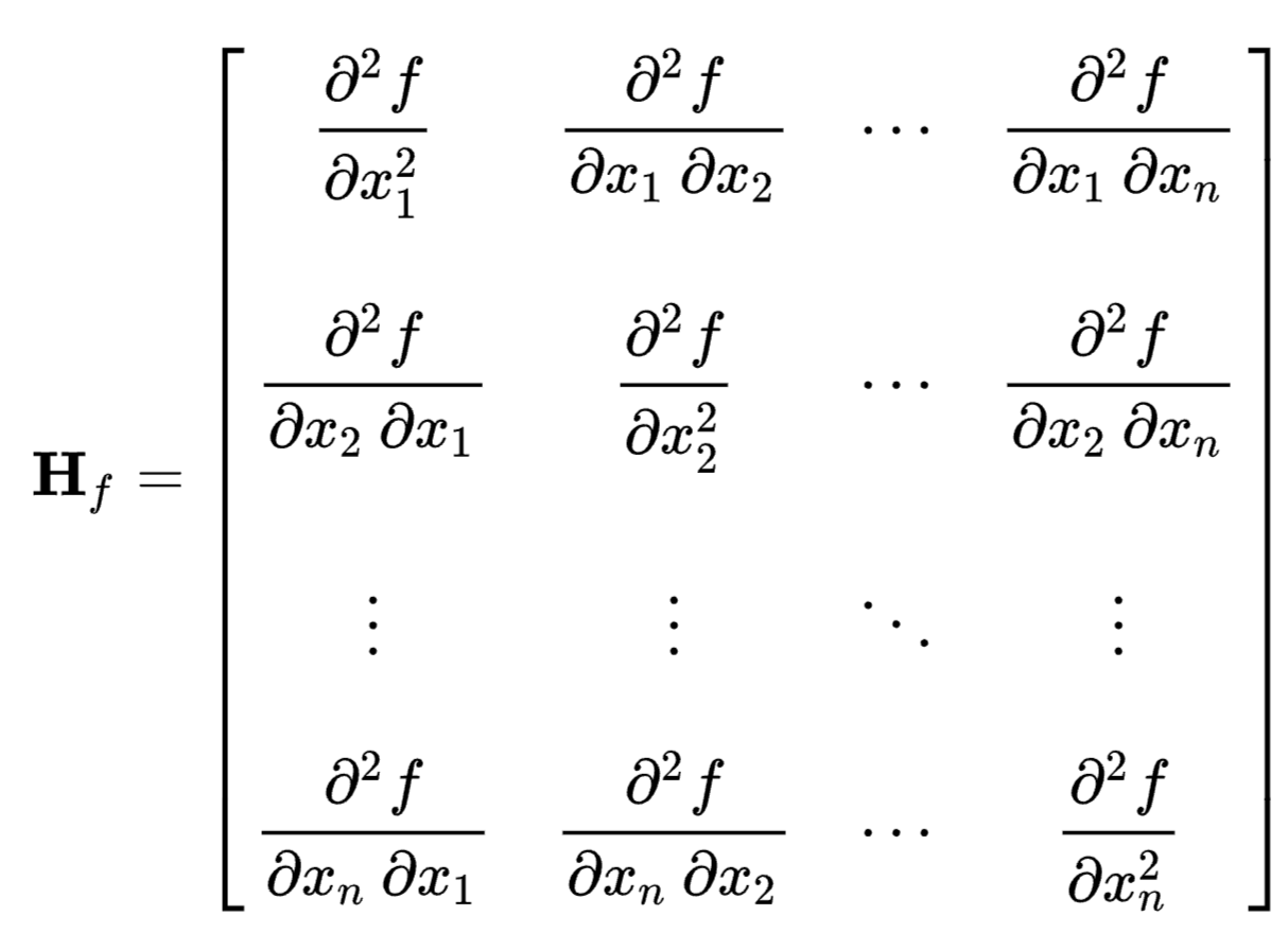 어떤 다변수함수의 모든 second partial derivative(2차 편미분계수) 들을 모두 묶어 행렬로 나타낸 것이 바로 Hessian matrix, ((H)) 입니다.