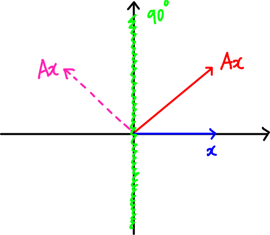 또한 ((A))((x))는 어떤 벡터 ((x))에 선형변환 ((A))를 가하여 바뀐 벡터를 뜻합니다. 왜 행렬 ((A))인데 이를 선형변환이라고 칭하는지는 반드시 이전 글을 봐보시는 걸 추천드립니다.