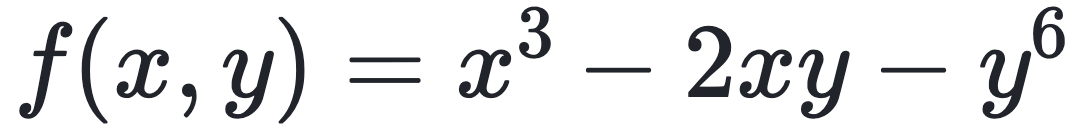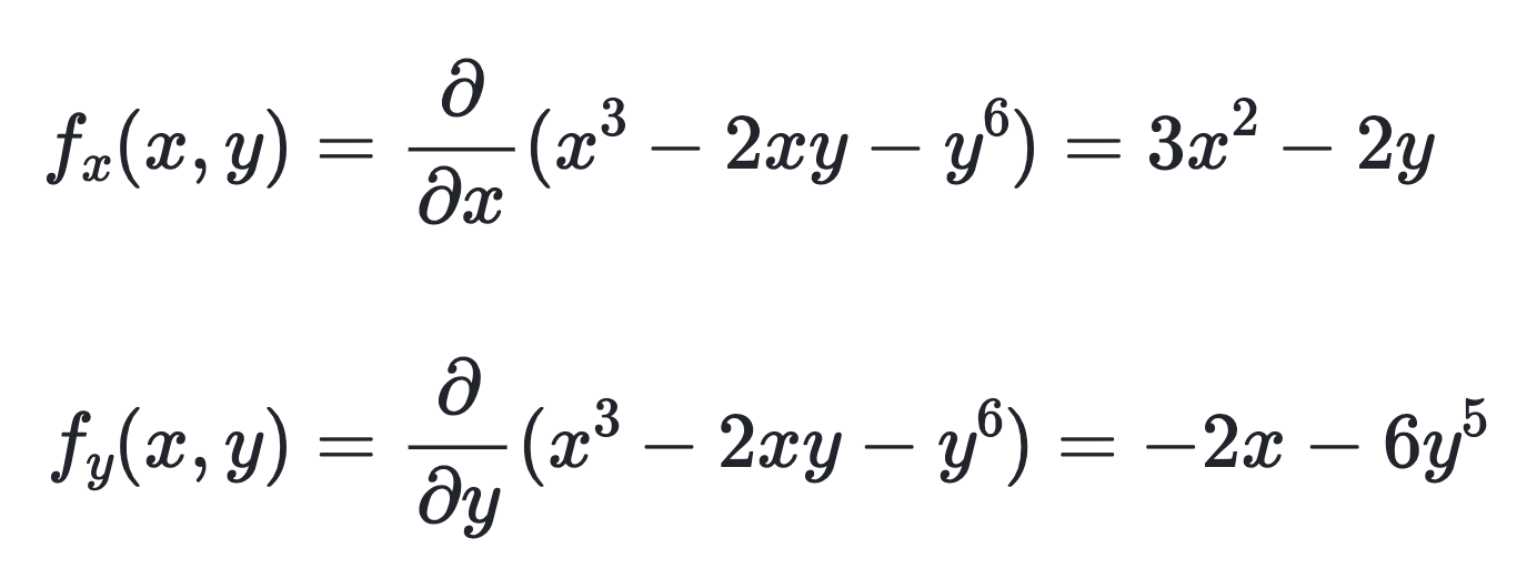 이렇게 되겠습니다. ((x))에 대해 미분할 때는, 뒤에 상수항인 ((y^{6}))은 아예 없어졌고, ((-2xy))는 ((x))의 계수가 ((-2y)) 라고 해석되어 ((x))가 없어지고 계수만 남았습니다. ((y))에 대해 미분해줄 때도 마찬가지도 진행됩니다.
