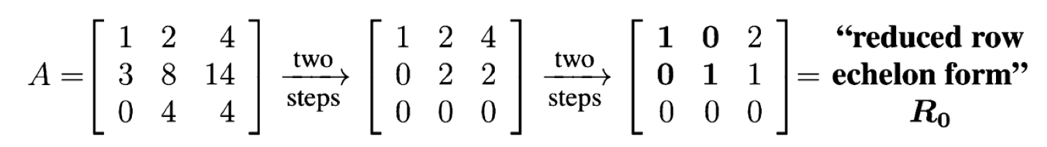 우리는 이전에 가우스 소거법을 이용하여 주어진 행렬 ((A))를 ref, row echelon form의 형태로 만들어주었습니다.