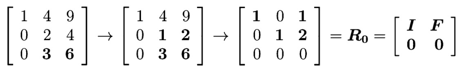 ((I))는 identity matrix이고, ((F))는 아마 free variable이라서 알파벳 ((F))를 사용하였을 겁니다. 얘는 independent column을 어떻게 조합해야 그 자리의 column이 나오는지를 알려주는 애 입니다. 실제로 col 1에 col 2 x 2를 해서 더하면 col 3이 나옴을 볼 수 있습니다.