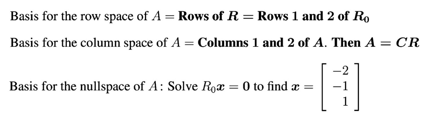 우리가 마지막으로 만든 rref는 기존 행렬인 ((A))의 row space와 column space, 그리고 null space를 알려줍니다.