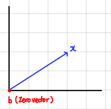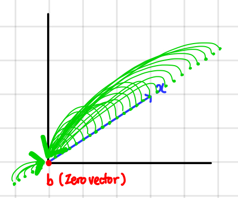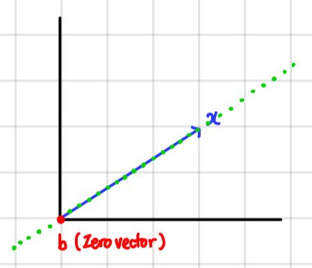 지금 파란색 ((x)) 벡터가 있고, ((b))는 zero vector인 상황입니다. 이 상태에서 ((A)) 변환이 ((x))를 ((0))으로 만드는 변환이라면, ((x))가 span하는 공간은 어떻게 될까요? 더욱 쉽게 생각하기 위해 ((x))가 span하는 공간인 선을 연속된 점들로 표현해보겠습니다.