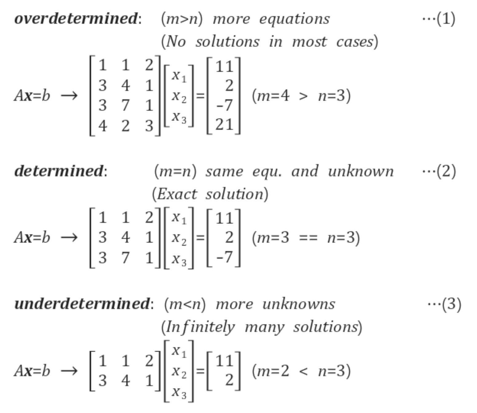 위의 사진을 예시로 들면, 지금 ((x))에는 미지수가 3개 있습니다. ((x₁)) 부터 ((x₃)) 이렇게 3개입니다. 그런데 방정식은 지금 4개 있습니다(행렬의 행이 4개입니다). 이렇게 행렬이 세로로 길쭉한 경우, ((m)) > ((n)) 인 경우는 방정식의 개수가 미지수의 개수보다 많은 상황입니다. 이러한 경우를 overdetermined된 경우라고 합니다.