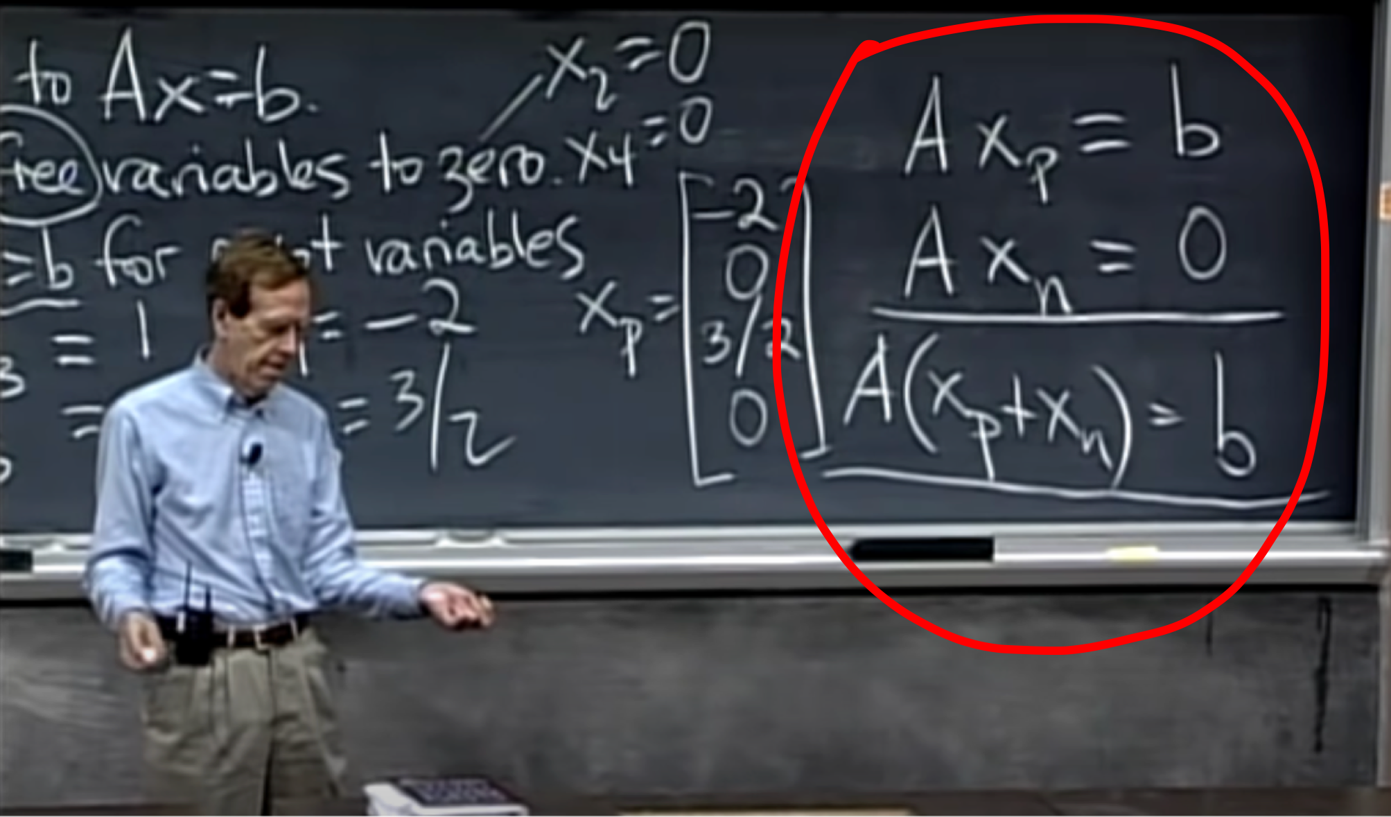 그래서 남아도는 애들이 아무 값이나 가질 수 있으므로, 또 무한하게 있는 경우입니다. ((A))가 ((m)) = ((n))의 , <특수한 경우> 처럼 무한한 상황이므로 똑같이 해주면 됩니다. 그냥 free variable 없이 풀어도 만족하는 해와, free variable들을 고려하여 nullspace, ((A))((x)) = ((0))인 애들을 고려해주면 되는 것입니다.