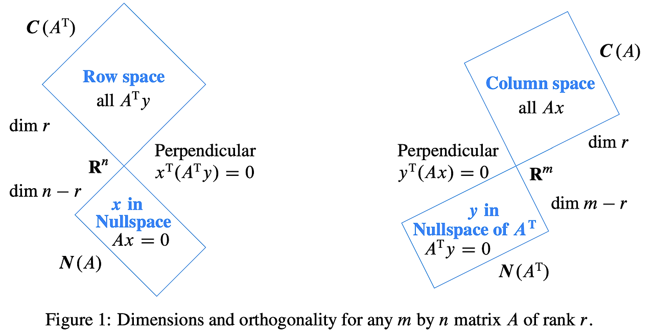 ((A))를 transpose해준다면, column space ((C(A)))와 left nullspace ((N(A^{T})))도 마찬가지로 직교한다는 것을 알 수 있습니다.