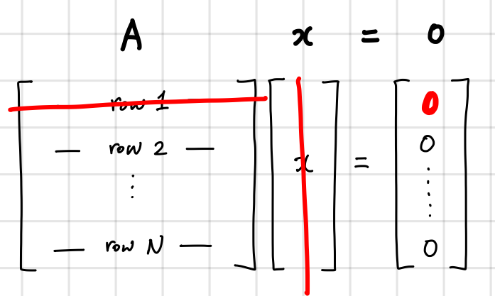 row 1과 ((x))랑 곱하면 영벡터의 첫째 0이 나오고,