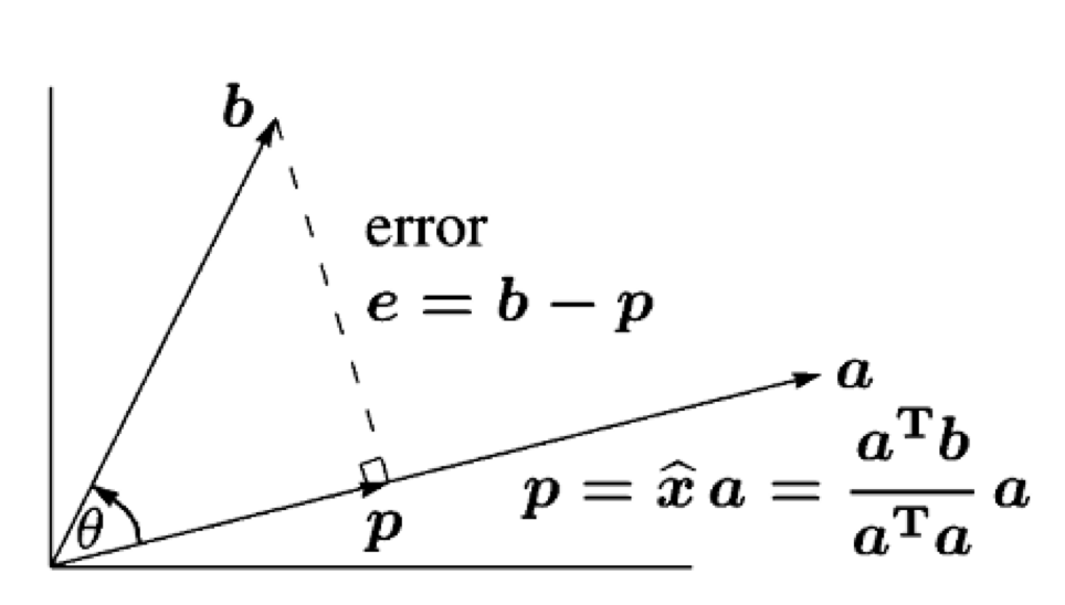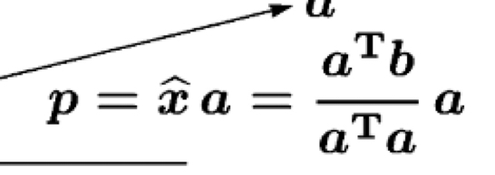 그래서 ((b))의 성질을 가장 그래도 보존하면서 ((a))로 끌어내린 것이죠. 가장 가까운 점을 찾기 위해서는, ((b))에서 ((a))로 수직(perpendicular)의 선을 내려서 만나는 점을 보는 것입니다. 여기서는 그 점이 ((p))라고 적혀있습니다. 이렇게 ((b))를 ((a))로 projection 시킨 결과물은 ((p))가 되는 것입니다.