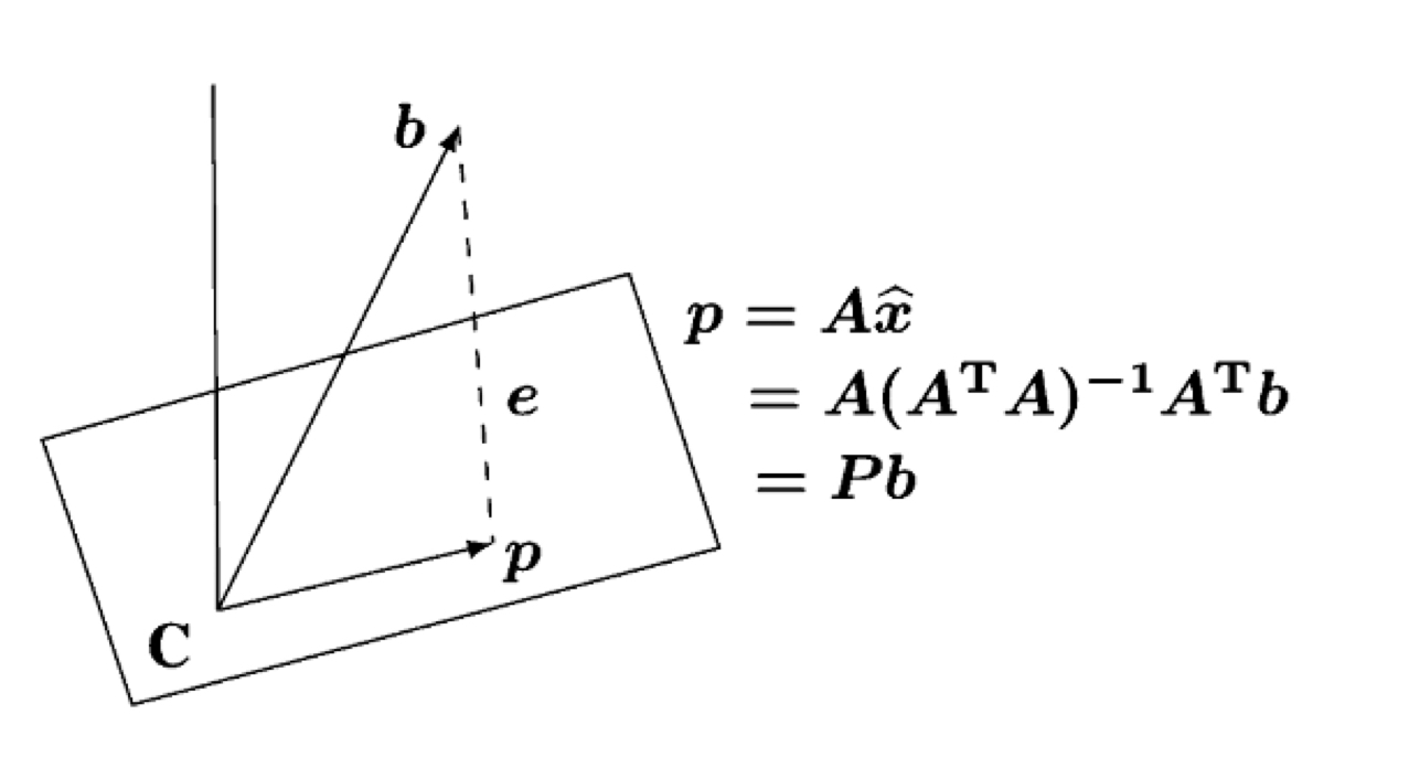 이렇게 ((b))가 ((C))인 column space 위에 없으므로, ((b))를 subspace에 투영하여((p))로 만들어 준 뒤, 근사해인 ((\hat{x}))를 구해주자는 것이 바로 그 배경입니다.