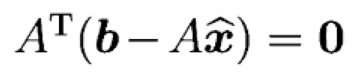 이전 게시물에서 설명을 했지만, ((b)) ((=)) ((p)) ((=)) ((e))인 점을 이용하여 유도되는데, ((e))와 column space가 직교한다는 사실을 이용합니다. ((e))를 ((b)) ((-)) ((p))로 표현하고, ((A))와 내적하면 0이 된다는 사실을 이용합니다(직교성).