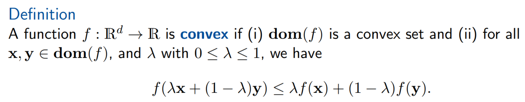 먼저 ((d))차원의 실수공간에서 scalar 아웃풋(그냥 숫자)를 내는 함수에 대해서 이야기를 하고 있습니다. 이 함수가 convex이기 위해서는 ((dom))( ((f)) )으로 표현되는 함수의 정의역(함수의 입력으로 들어가는)이 convex set이어야 합니다.