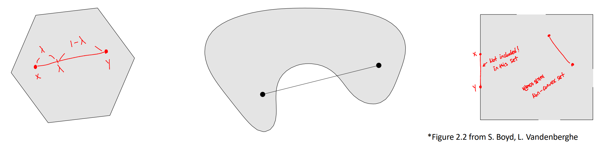 즉, 점 ((x))와 ((y))가 convex set인 집합 ((C)) 안에 속하고, ((\lambda))가 저 범위를 따를 때,