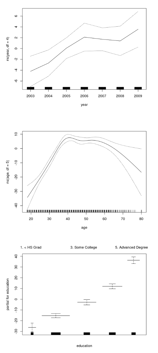 다음은 Wage(월급)에 영향을 미치는 predictor variable(Year, Age, Education)의 effect을 GAM 모델링한 결과이다.