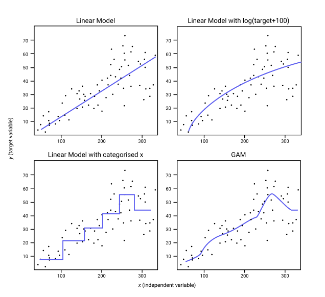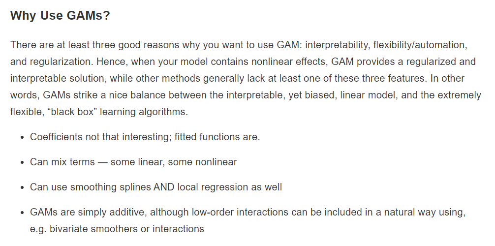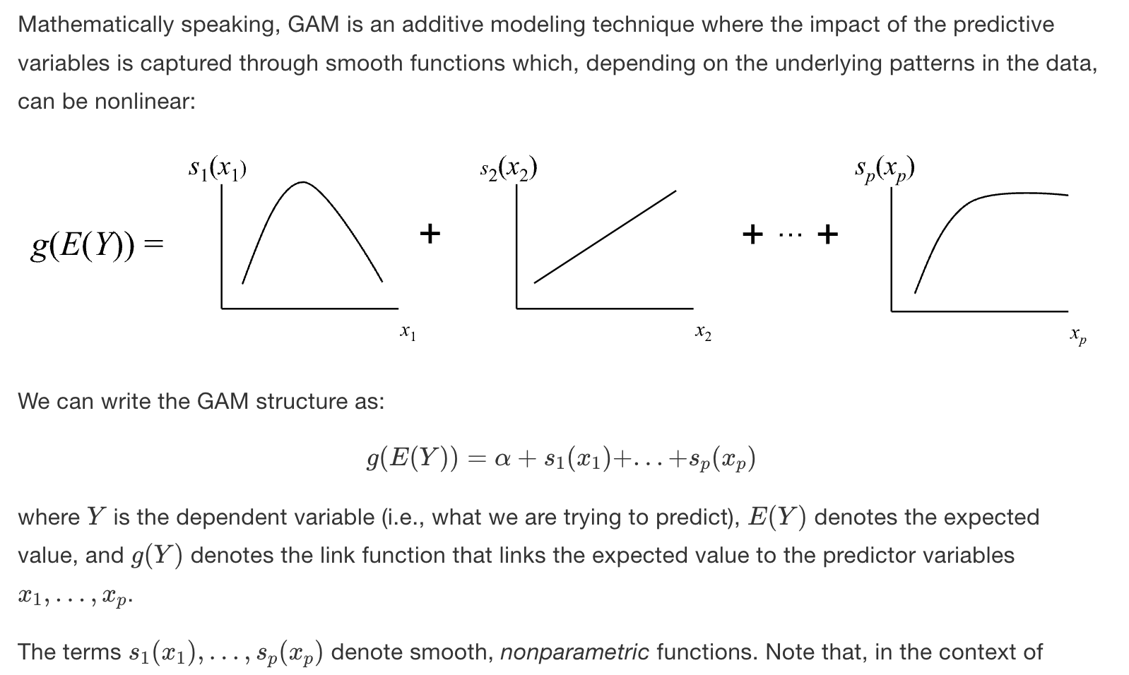 GLM의 연장선이며 smooth function을 추가해 독립변수와 종속변수 간의 non-linear한 관계도 capture 할 수 있게 해주는 모델이다. GLM과 GAM 모두 모델 분석 과정 중 각 독립변수가 종속변수에 기여하는 계수값들이 도출되므로 Interpretable Machine Learning이라고 할 수 있을 것이며, 이는 Decision Making에 매우 중요하다고 할 수 있다.