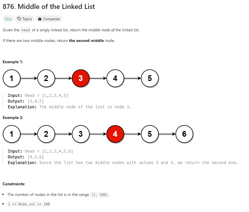 만약 fast pointer가 linked list의 끝에 도달하거나 끝보다 더 뒤에 있는 식으로 도달한다면, slow pointer는 자동으로 중간에 위치할 것이다(속도가 딱 반이므로, fast가 끝에 도달하면 slow는 그 반절인 중간에 있을 것).
