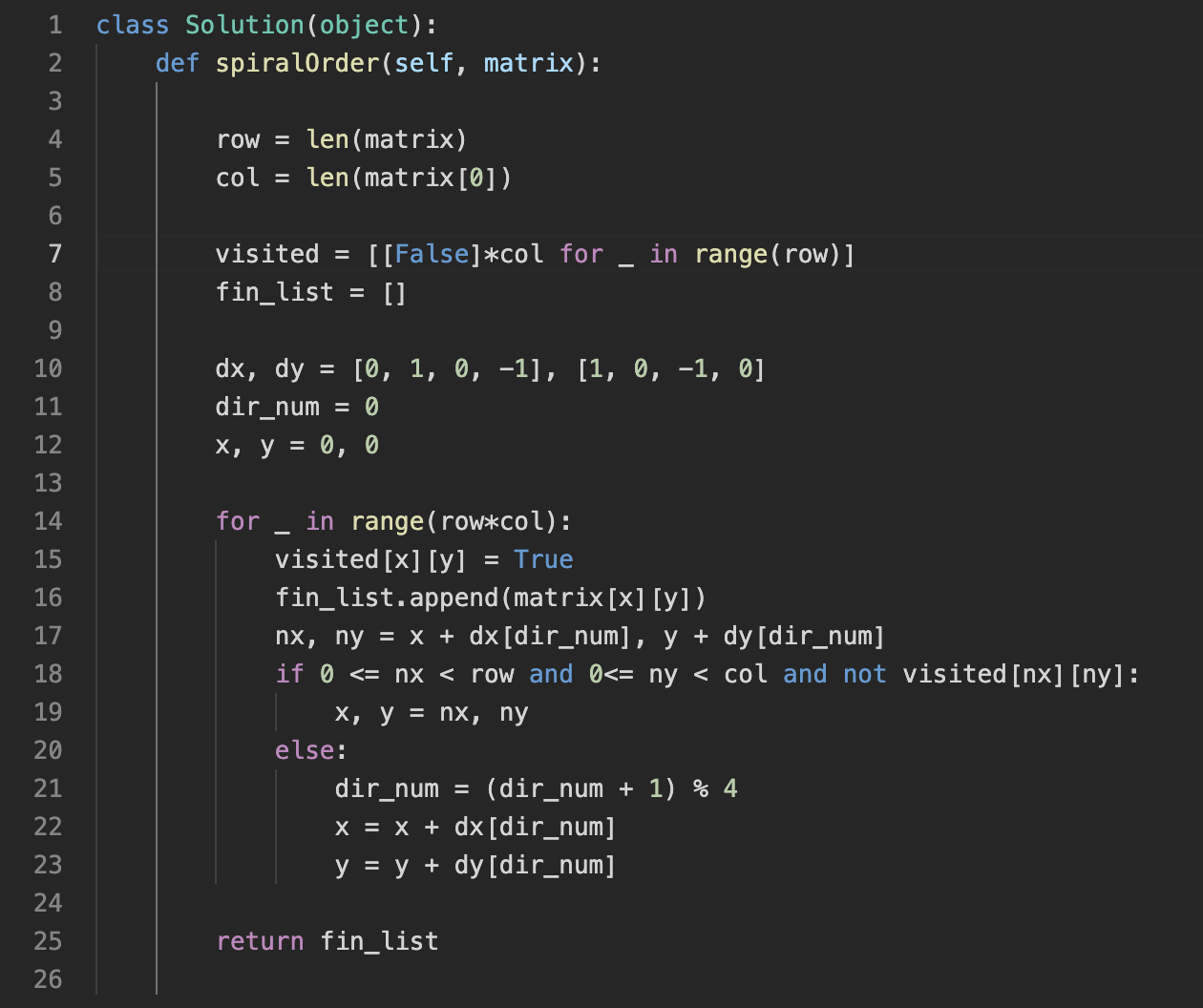 기억할 것은: dx, dy 테크닉은 2D Array에 좋고 / [i][j]를 기준으로 값을 정해준다 / 초기 방향 설정과 각각의 방향 설정인 dir_num이 필요하다 / 시계방향 회전은 (dir_num + 1) % 4로 나머지가 4 밑으로 나오는 것을 이용해서 방향전환을 한다 / 방문기록을 체크하기 위해 초기에 False로 채워진 visited 배열이 필요하다.