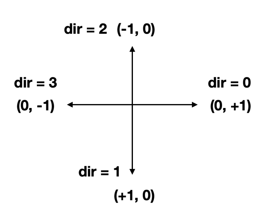 이렇게 좌표를 미리 세팅해주는 것을 뜻한다. 미리 dx와 dy 리스트를 만들어놓고 그 안에 방향값을 저장해놓으면, dx dy의 인덱스만 바꾸어도 x,y 좌표 방향을 한 번에 전환해줄 수 있다. 초기의 방향은 정하기 나름인데, 이 문제의 경우 일단 시작하면 동쪽으로 가기 때문에 동쪽을 0으로 놓고 초기 방향인 dir_num에 0을 할당해 주었다(dir_num = 0).