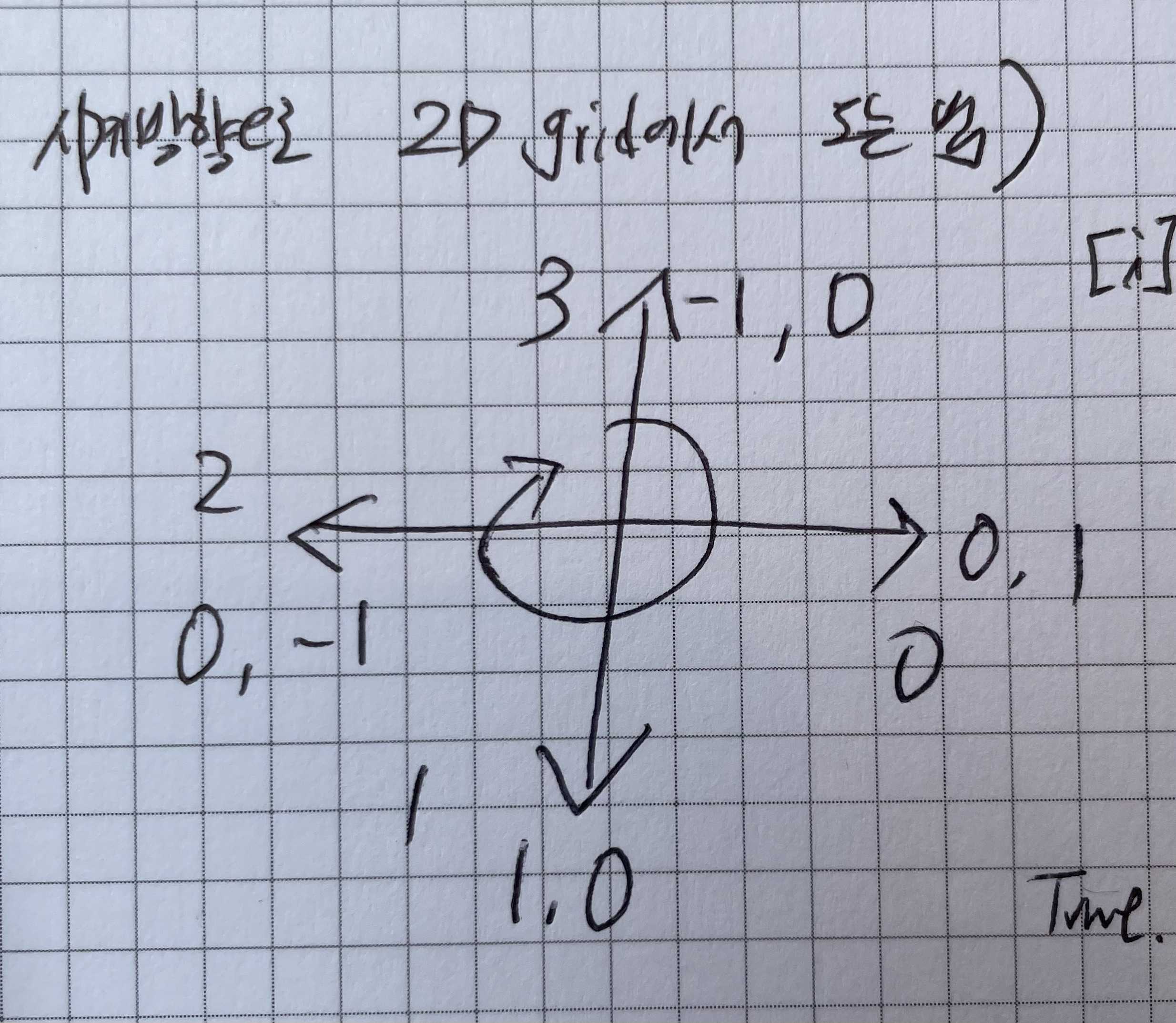 이때 중요한 것은 dx dy의 값은 리스트 matrix[i][j]의 i와 j로 생각해주어야 한다는 것이다. 그래서 오른쪽으로 한 칸 가면 row는 동일하고 col 인덱스는 하나 증가하기 때문에 0, 1