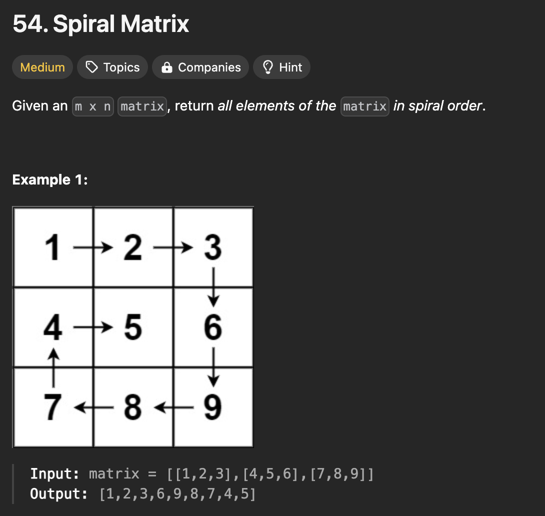 또한 matrix의 노드 갯수만큼 순환할 것이므로, 그리고 벽에 막히는지 체크(다음 인덱스가 matrix의 row / column range 안에 있는지)를 알기 위해 row 와 col 변수가 각각 있다.