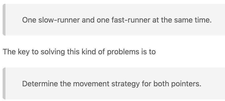 이런 식으로 두 포인터의 속도를 다르게 하는 방법도 있다. 예를 들어, 리스트의 중간의 element를 가져오고 싶다면 한 포인터는 한 칸씩 가도록, 한 포인터는 두 칸씩 가도록 해서 속도가 더 빠른 포인터가 끝에 도달할 때, 속도가 느린 포인터는 중간 element를 가져올 것이다.