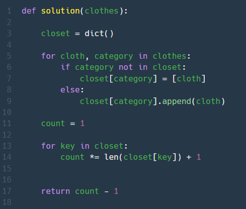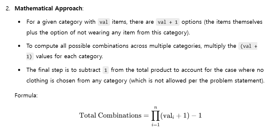 하지만, 모든 카테고리를 다 꺼버리는 경우의 수가 생긴다. 우리는 적어도 하나는 입어야 하기 때문에 모든 카테고리를 다 꺼버리는 경우의 수를 빼주기 위해 - 1을 마지막에 해주는 것이다.