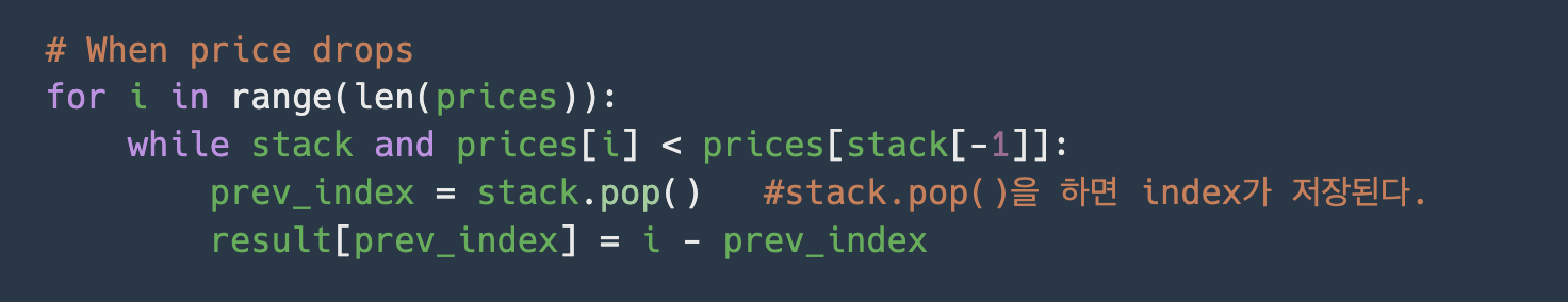 여기 보면 기준점이 되는 index를 stack.pop()으로 할당해주었다.