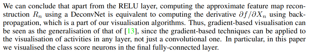저자들은 Deconvolution과의 관계성도 잠깐 설명하는데, 핵심은 ReLU를 제외하고는 feature map reconstruction이 DeConv를 통해서 derivative를 구하는 것과 equivalent 하다고 설명한다.