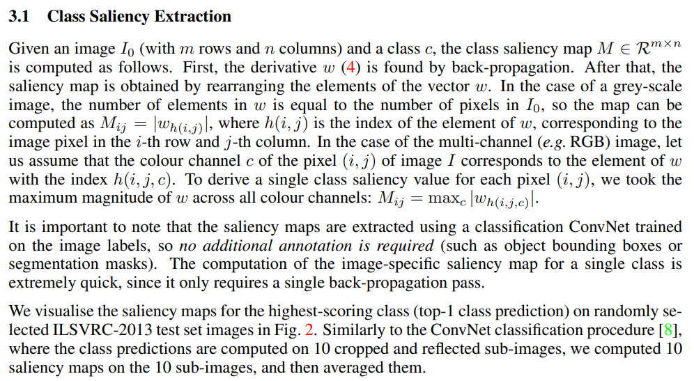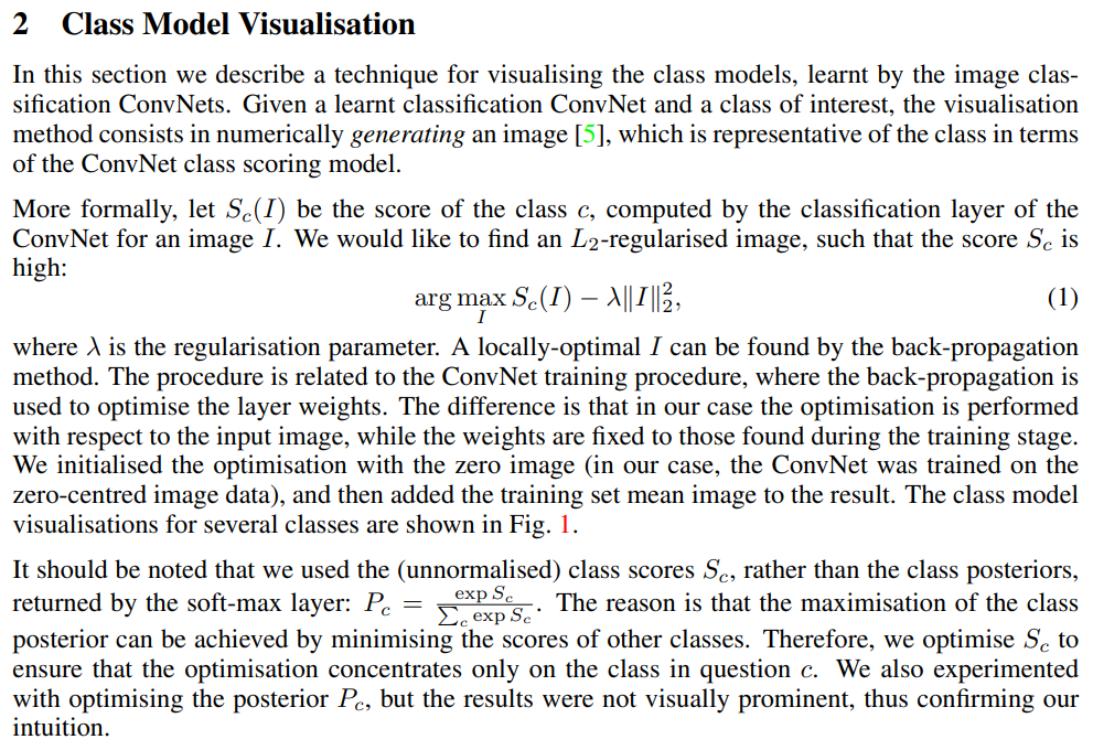 Class Model Visualisation에서는 zero image에서부터 새로운 이미지를 합성하는 반면, 여기서는 주어진 이미지 I의 특정 부분을 highlight하는 방법이다. 당연히 특정 부분은, 그 이미지로 하여금 특정 class c에 분류될 수 있게 하는데에 가장 큰 역할을 한 부분이다.