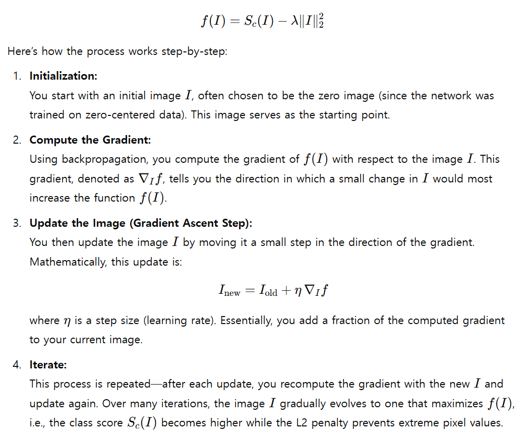 Backpropagation으로 Sc(I)에 대한 이미지의 gradient를 계산한 후, gradient ascent를 통해 초기의 zero image를 점차 바꿔나간다. 그 과정을 수식으로 보면 다음과 같다:
