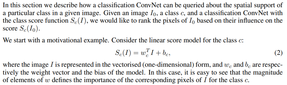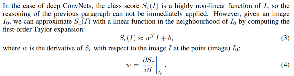 어떤 이미지가 class C에 속할 점수인 Sc(I)를 linear model로 가정한다면, 자연스럽게 우리는 저기 w term을 가중치라고 생각할 수 있다. 우리가 원하는 "중요도"를 w를 통해 알 수 있는 것이다.