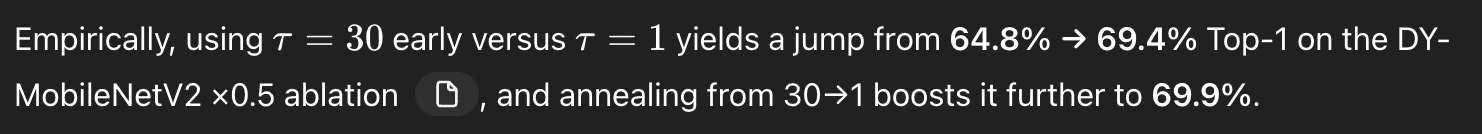 위에 보면, attention 가중치가 0에서 1 사이의 범위를 가져야한다는 조건은 CondConv라는 방법론이 먼저 내세운 조건이고, 저자들은 여기서 한 발자국 더 나아가 다 합쳐서 1이 되어야한다는 조건까지 추가한 것이다.