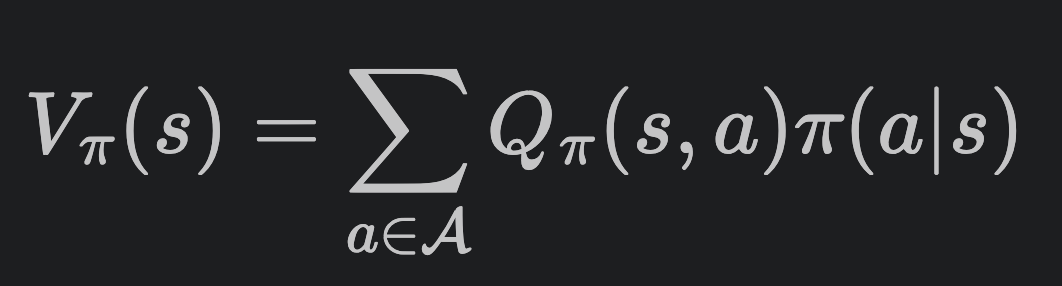 여기에 더하여, Q-value를 이용해 state-value를 알아낼 수 있다. 위의 policy를 다시 한 번 생각해보자. policy는 action들에 대한 확률분포였다. 그리고 Q-value는 action의 가치이다. 그러면 한 state에서 가능한 모든 action들이 각각 일어날 확률과, 이에 대한 각각의 value도 있으니, 그걸 조합하면 한 state에서의 value를 얻을 수 있지 않을까?