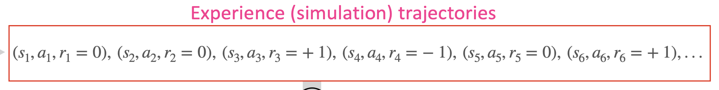 결국 하나의 timestep에서 일어나는 것들은, (어떤 s에서, a 행동을 취하고, r의 보상을 얻는다) 가 된다. 이를 간단히 표현하면, (s, a, r) 이며, agent가 경험하는 것들이다. 이것을 episode, 또는 trajectory 라고 부르며, agent의 경험은 이것들의 연속이다.
