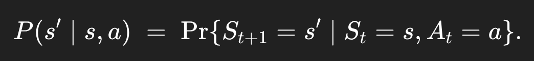 state-transition probability는 어떤 state s에 있는데, 이때 action a를 했을 때, 어떤 다른 state s'로 넘어갈 확률이다.