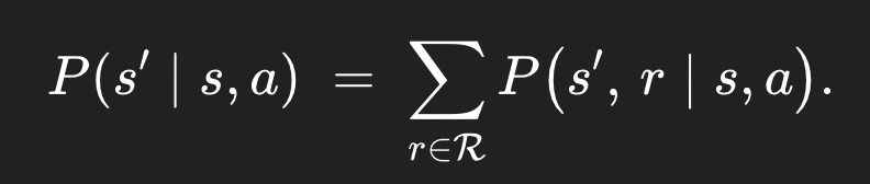 이렇게이다. 왜 그런가 보면, P(s', r | s, a)는 어떤 상태 s와 action a가 주어졌을 때 어떤 새로운 상태 s′와 특정 reward r이 나올 확률을 알려준다. 근데 지금은 우리는 특정 reward까지는 필요없다. 그냥 새로운 상태 s'에 도착할 확률만 알면 된다. 그러니까 모든 특정 reward r의 경우의 수를 고려해주는, marginalization을 reward에 대해 해버리면 된다.