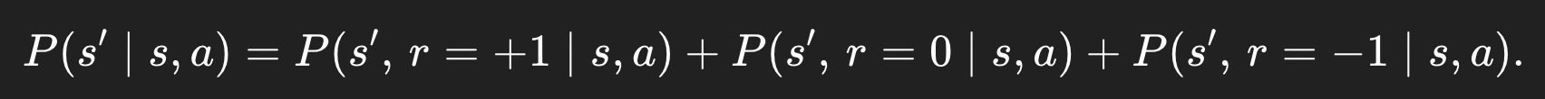 reward가 -1이면서 다음 상태 s'로 넘어갈 확률 + reward가 0이면서 다음 상태 s'로 넘어갈 확률 + reward가 1이면서 다음 상태 s'로 넘어갈 확률 = 그냥 다음 상태 s'로 넘어갈 확률