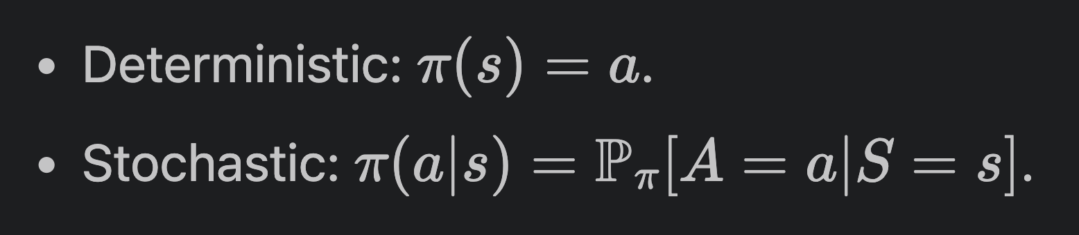 본인은 이 개념에 대해서 처음 들여다볼 때 매우 헷갈렸는데, "확률" 이다. 물론 deterministic한 case에 대해서는 Policy는 action a를 뱉어내고, stochastic한 case에서는 여러 action이 각각 나올만한 확률분포를 뱉어내지만, 대부분의 경우에서 우리는 stochastic한 경우를 많이 볼 것이므로, 여러 action들이 나올 확률이라고 보면 된다. 우리는 agent가 최적의 행동양식을 가지길 원함으로, optimal한 policy를 원한다.