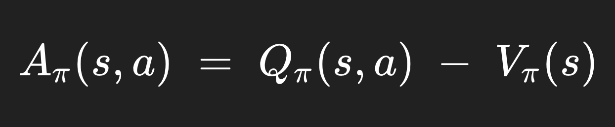 이기 때문에, policy에 따른 state의 기본값에 비해서 어떤 action이 얼마나 좋냐/나쁘냐 를 상대적으로 볼 수 있다. 직관적으로 말하면, 기본일 때에 비해서 딱 요 action이 가지는 장점만 쏙 뽑아낸 것이다.