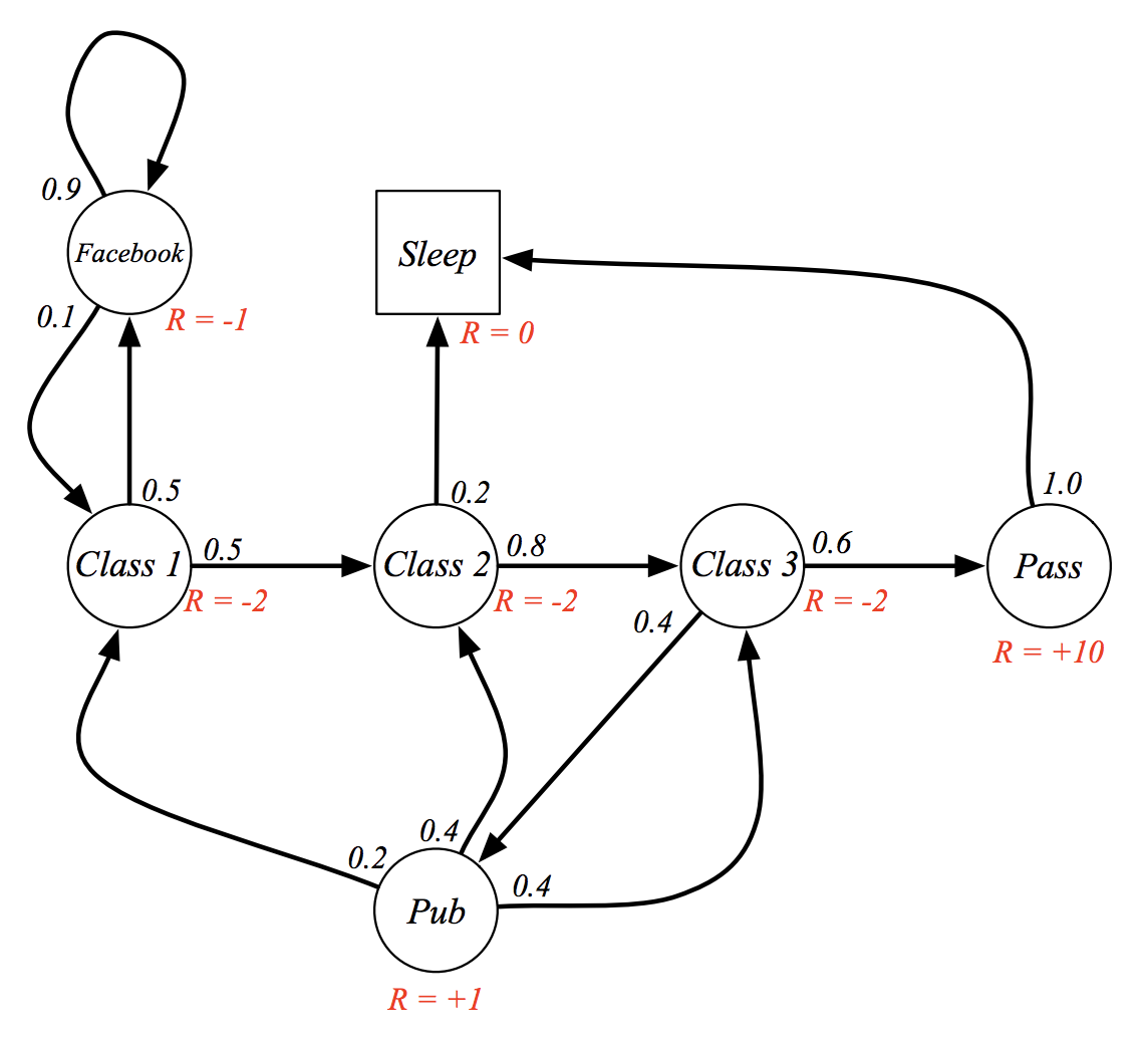 Class 1에 출석한다, Facebook을 한다, Pub에 간다, Sleep 과 같은 다양한 state와 action들이 있고, 그에 따른 transition probability도 있으며 (0.2, 0.4 등등) 각각에 따른 보상도 빨간색 R로 적혀있다.