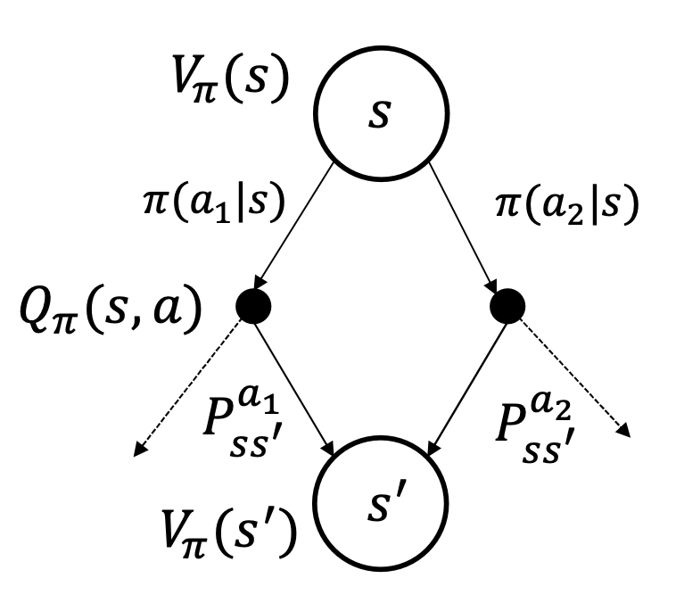 그런데 아까 Bellman Expectation equation에서 각각 뒤에 있는 Q랑 V를 대체할 수 있었다. 대체해보자.