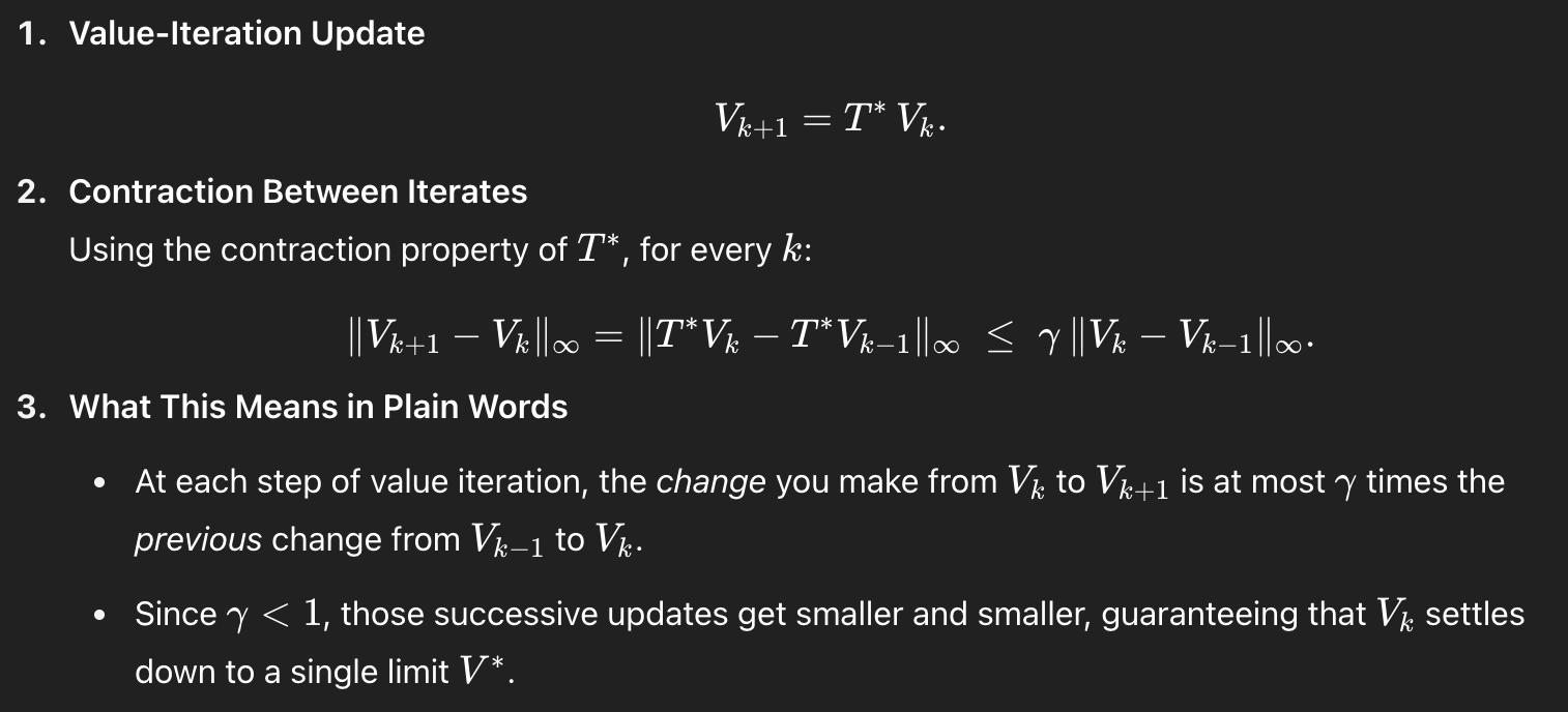 어지럽게 보지말고, 밑에 T를 적용하여 매핑한 결과가, 최소한 감마만큼 보다는 더 작은 거리를 가진다는 걸 알 수 있다. 이렇게 되면 우리는 iteratively하게 T (Bellman optimality equation이다) 를 적용하면, 계속 거리가 짧아지고, 결국에는 fixed point로 converge 할 수 있는 것이다.