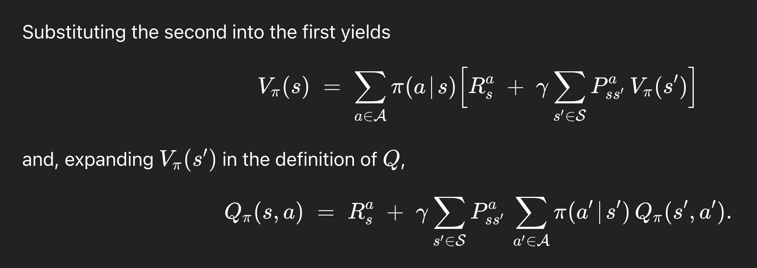 이렇게 해석하는 것이다. 근데 여기서 보면 밑의 Q를 이용해서 첫 번째 V 식의 Q를 대체할 수 있다. 그리고 밑의 Q 식 같은 경우에는, 뒤에 V(s')가 있는데, V는 Q를 이용해서 다시 쓸 수 있었다 (첫 식을 봐라) .