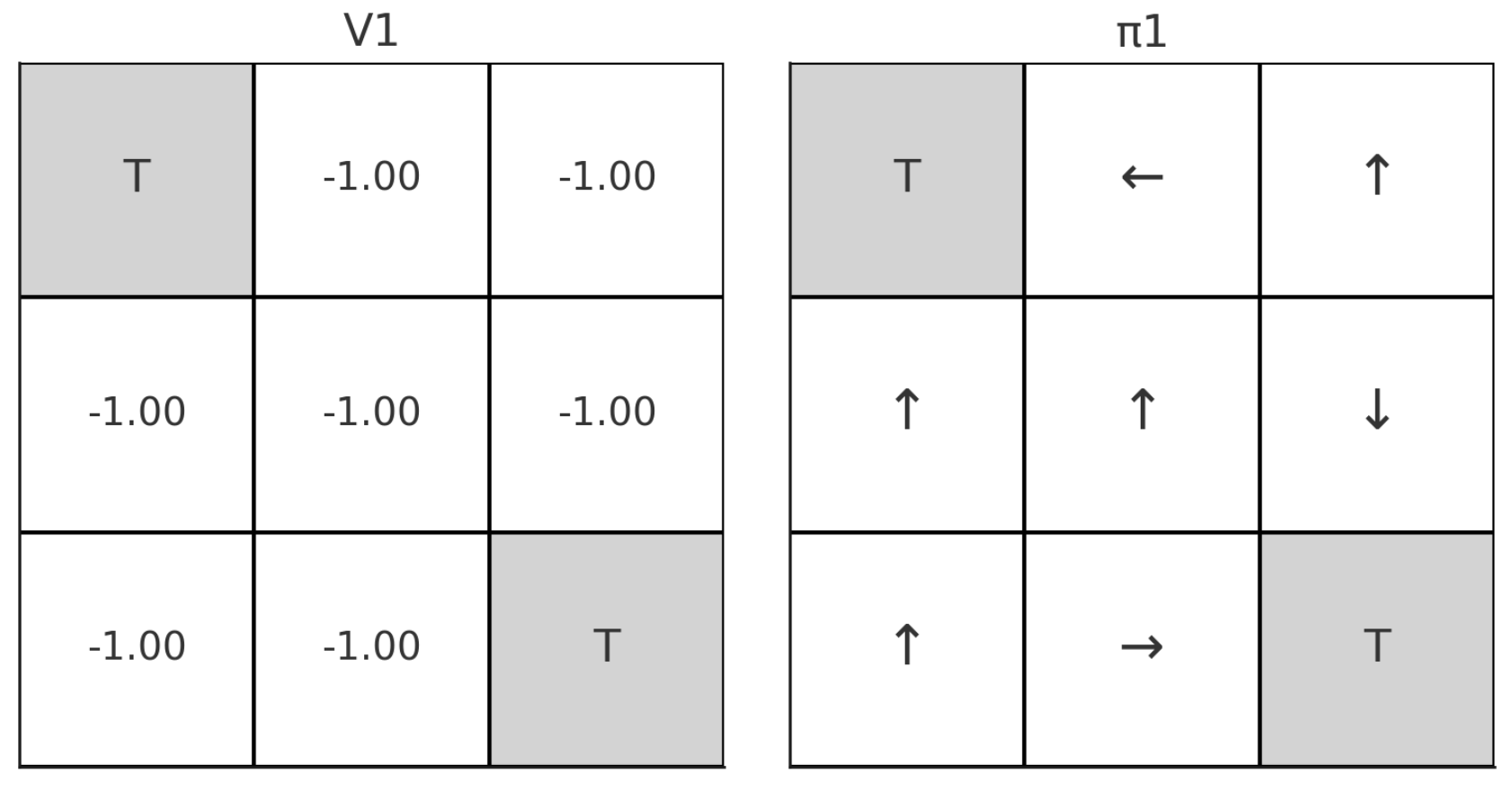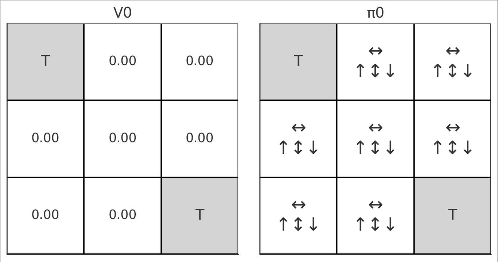 Initial인 V0에서는 모든 reward를 0으로 세팅해주고, policy π 또한 처음 설정해 준 1/4의 uniform한 action distribution을 가진다.