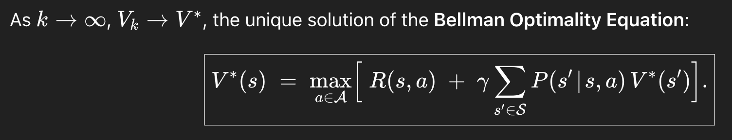 Value iteration은 Bellman Optimality Equation을 사용한다.
