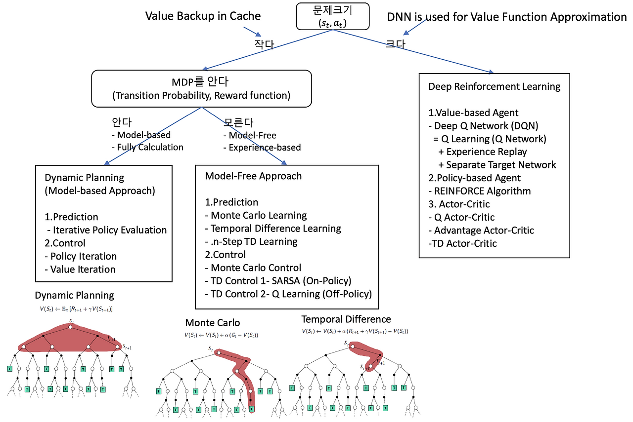 우선은 environment에 대한 정보를 다 알 때 사용하는 Dynamic Programming 부터 시작하여, environment에 대한 정보를 모를 때의 방법들을 다루고, 이것도 모자라 environment에 대한 정보도 제대로 모르는데 문제가 점점 커지는 경우 (state, action space가 매우 큰 경우), DNN을 사용해서 Value, Q, policy를 모델링하는 방법으로 넘어가도록 하자.