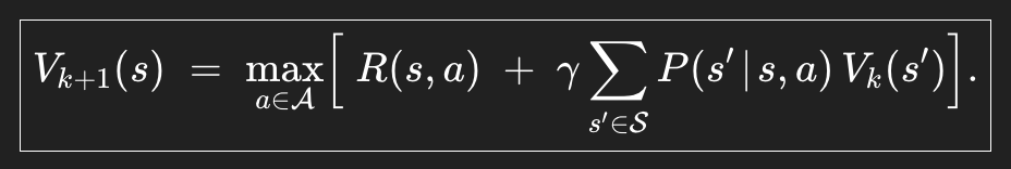 초반부에 이야기 했듯이, Value iteration은 evaluation과 improvement를 한 방에 하는 방법이다. 이건 위의 bellman expectation equation을 쓰는 policy iteration과 다르게 bellman optimality equation을 사용한다.