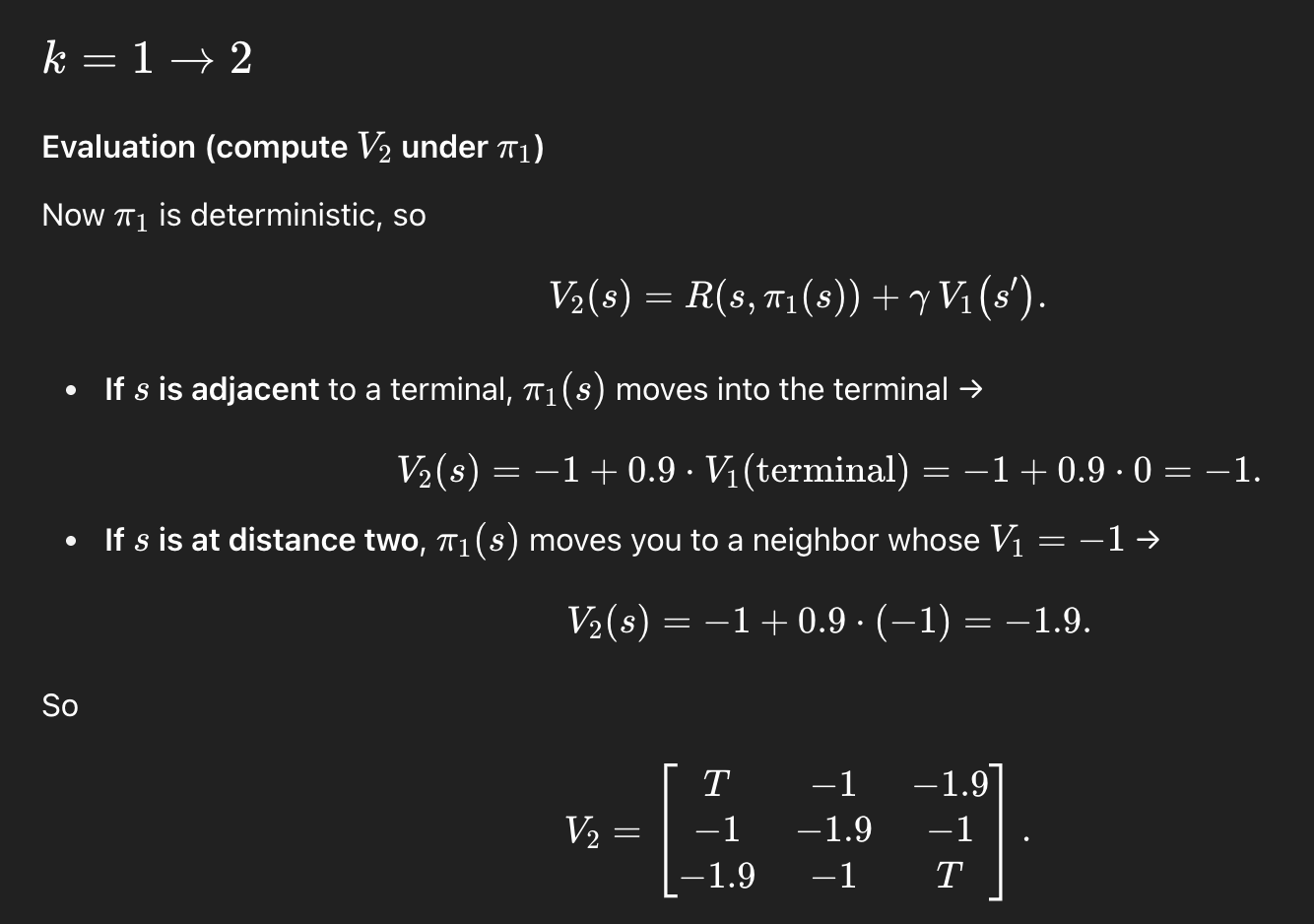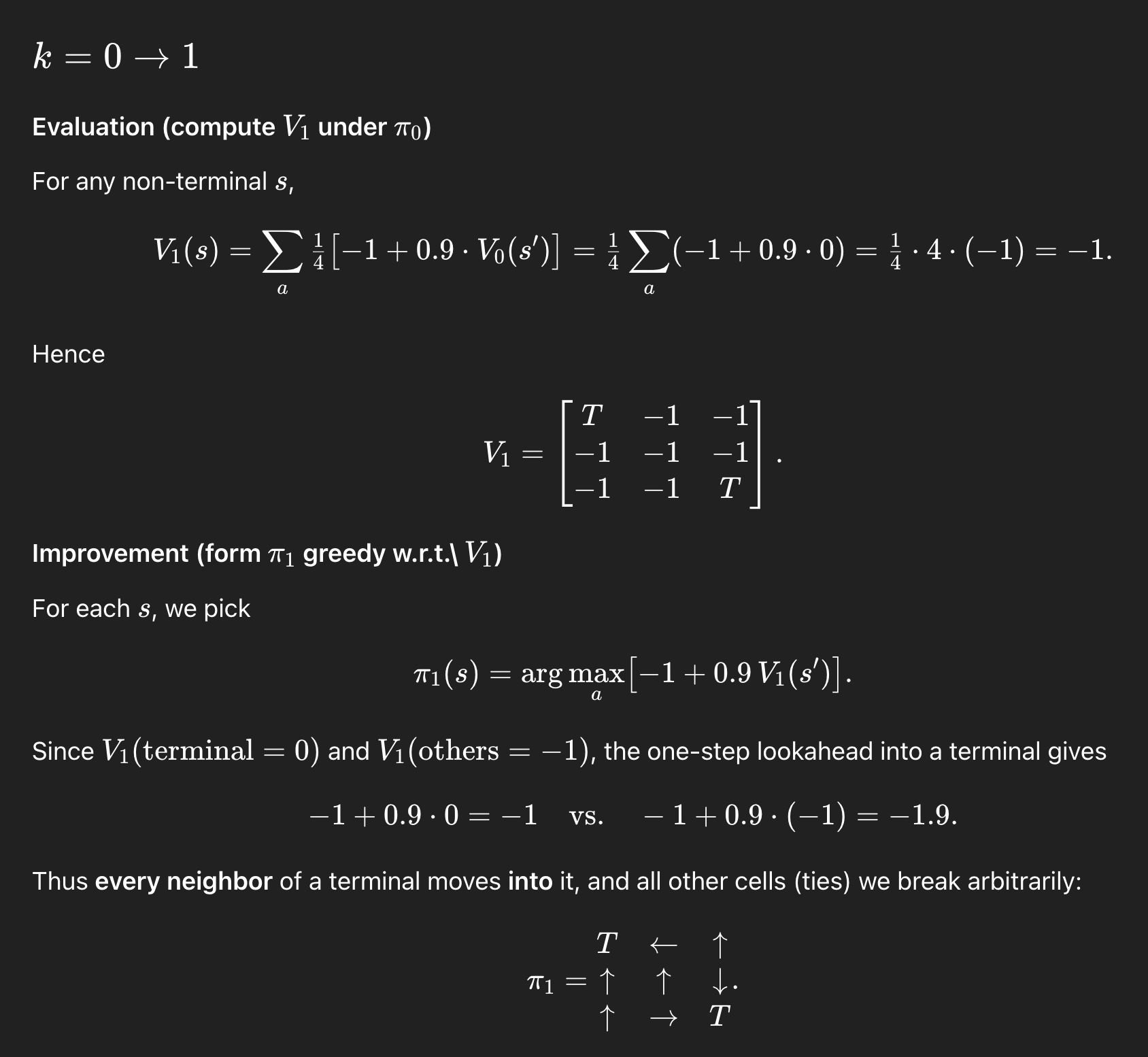 여기서 포인트는, 우리가 어떤 한 점에서 시작하는게 아니라 모든 칸에 대한 보상과 path를 고려하기 때문에 모든 칸에 대해서 계산이 된다는 점이다. 이 포인트는 맨 마지막에 full-width backup과 sample backup의 차이를 이해하는데에 매우 중요한 직관이 된다.