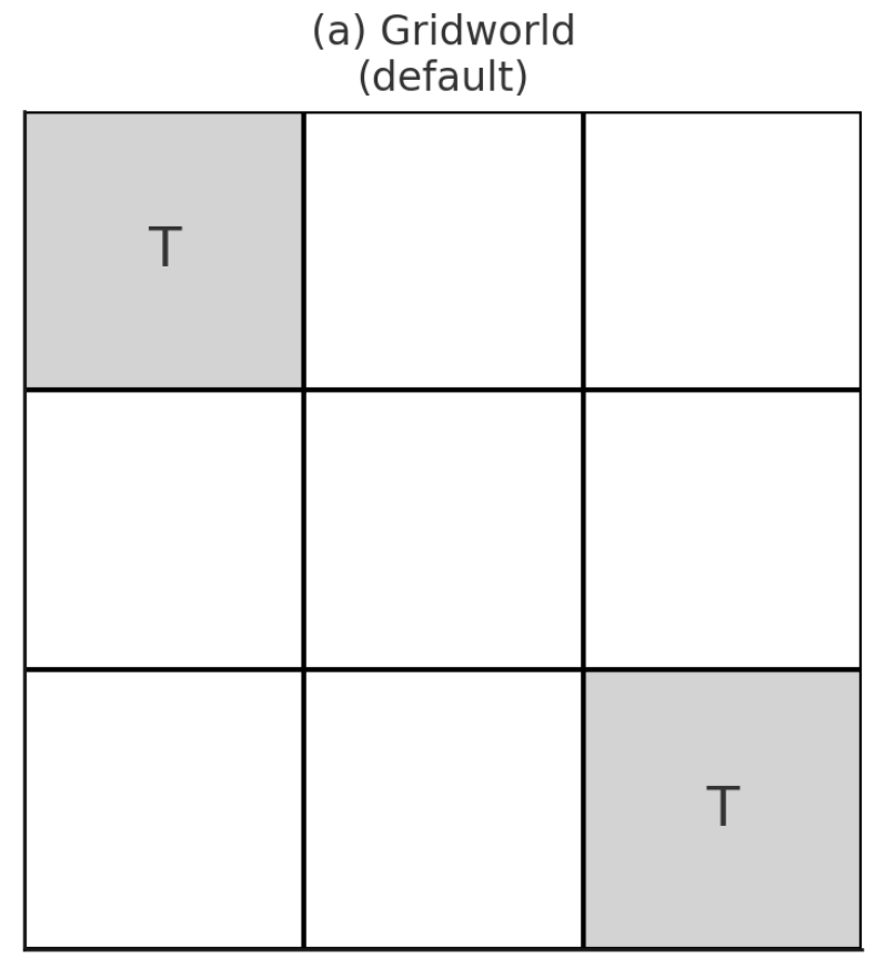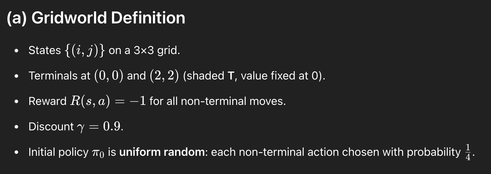 3x3 grid이고, Terminal state에 들어가면 reward 0을 준다. terminal state에 들어가지 않는 행동들은 매 timestep마다 -1의 reward가 주어진다. 그러니까 계속 음수의 reward를 받지 않고 싶다면 최단으로 terminal state에 들어가는게 optimal일 것이다. 감마는 0.9로 설정하고, initial policy는 (위, 아래, 왼쪽, 오른쪽) 이렇게 각각 uniform하게 1/4의 확률로 선택되도록 하는 policy가 있다고 해보자.