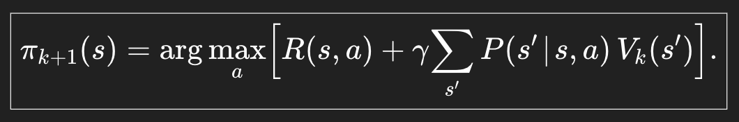 마찬가지로 iteratively하게 진행된다. 저 V(s) 값을 알고 있고, R과 P도 알고 있으므로 그 값을 가장 크게 만들어주는 action a가 바로 업데이트 된 policy이다.